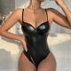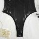 A bodysuit is a one-piece form-fitting or skin-tight garment that covers the torso and the crotch, and sometimes the legs, hands, and feet, and cannot be used as a swimsuit. The style of a basic bodysuit is similar to a one-piece swimsuit and a leotard, though the materials may vary.